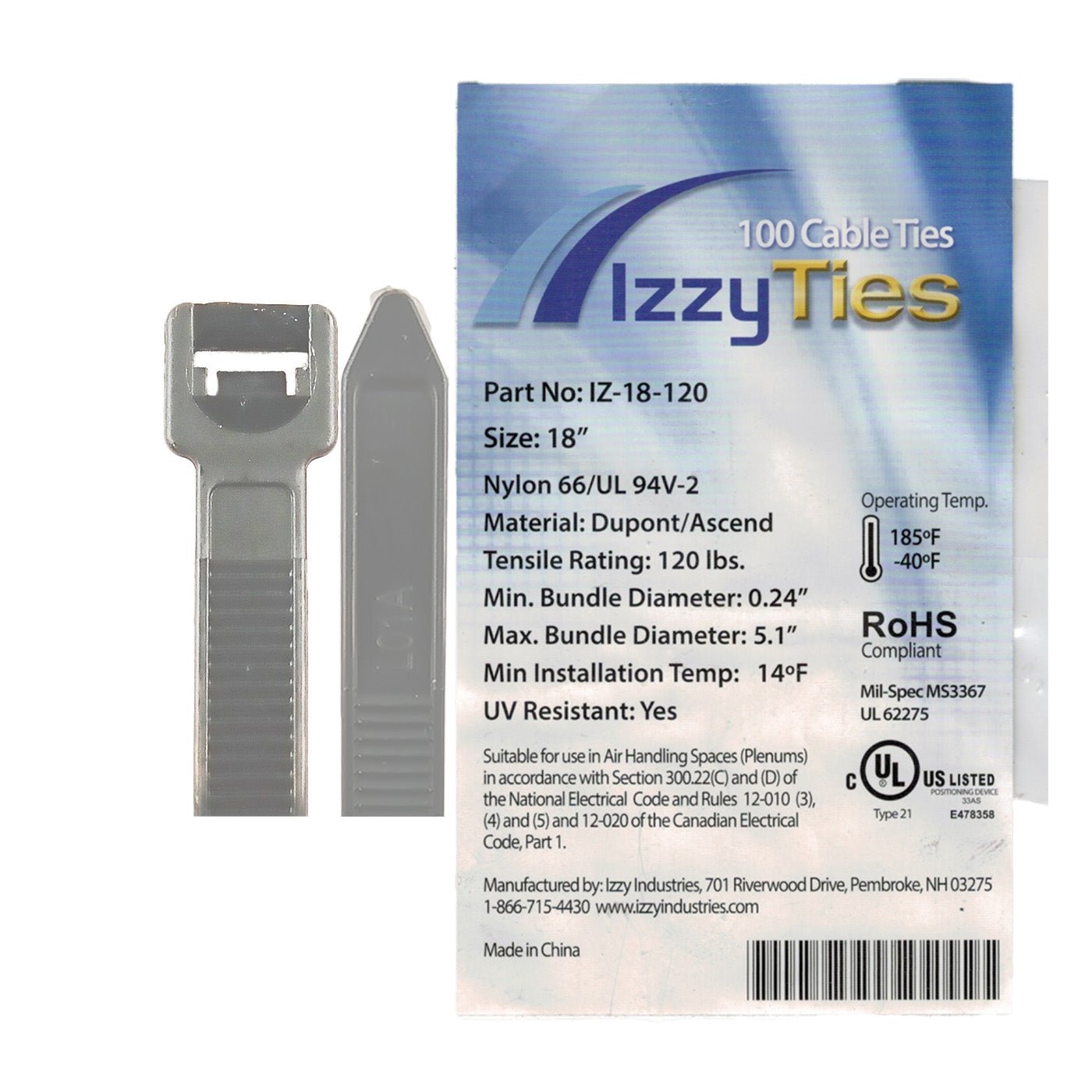 Our nylon zip ties are made for maximum strength and durability and can be used for a variety of applications. They are made of premium grade, 6/6 nylon and can withstand temperatures of up to 150°F, meeting UL material standards. Closely spaced positive-locking teeth allow for easy adjustment. Zip ties have smooth, rounded edges that will not cut insulation and are comfortable to use with bare hands. 18” nylon zip ties have a tensile strength of up to 120 lbs. and come in a bag of 100.